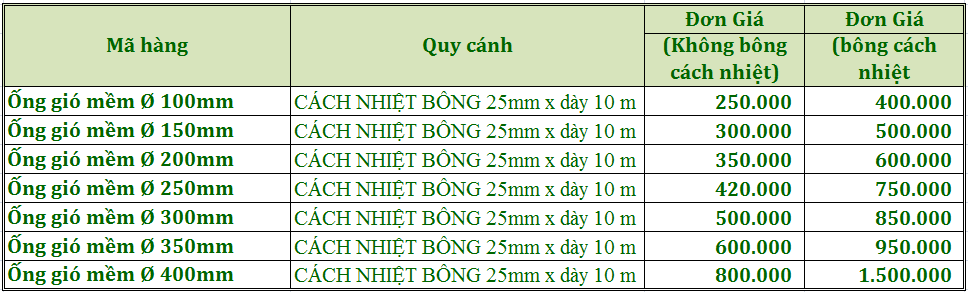 - Ống thông gió mềm có 2 loại có bông cách nhiệt và không có bông cách nhiệt.